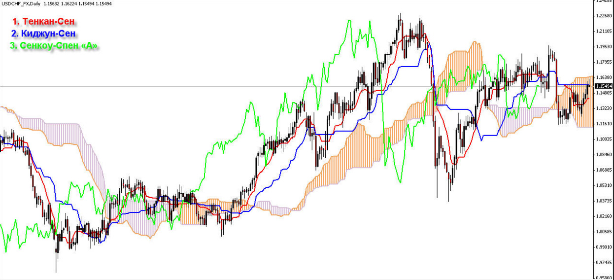 - Kijun-sen (синяя линия) показывает среднее значение цены за второй промежуток времени.