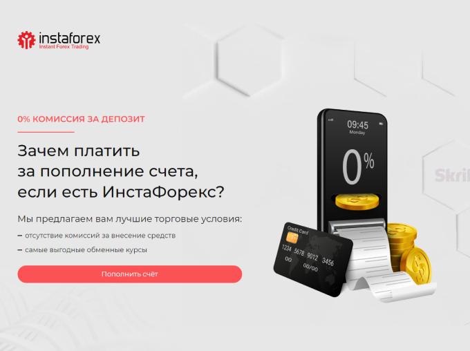 InstaForexda eng arzon valyuta kursi va hisobraqamani to’ldirish uchun komissiya yo’q. Mijoz qaysi to’lov tizimini ishlatadi, qo’shimcha komissiyalarini hisobdan tashlamaydi.